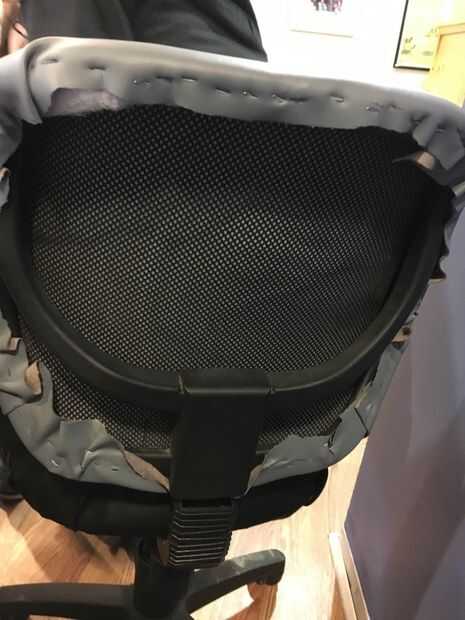 Para la parte trasera de la silla, use el mismo adhesivo como antes para enlazar el algodón a la parte delantera de la parte posterior de la silla. Utilizar tanto como desee manteniendo plana para que permanezca cómodo para la espalda. Use la misma pieza de cuero que corta de la parte inferior cubierta de algodón, o usar otro material tienen a mano. En este caso, hemos utilizado cuero de recambio. Utilice el pegamento para sujetar la zona media y otra vez utilice grapas para envolver el material en exceso al otro lado y seguro.