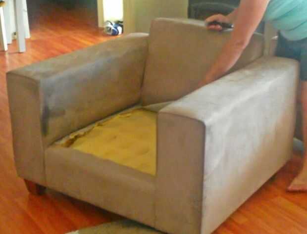Después de encontrar la pieza que tocará la víctima a su proyecto, (excepto el listón de apoyo) tira hacia abajo toda la tapiceria, espuma y guata hasta que te queda sólo el marco desnudo de la cama.