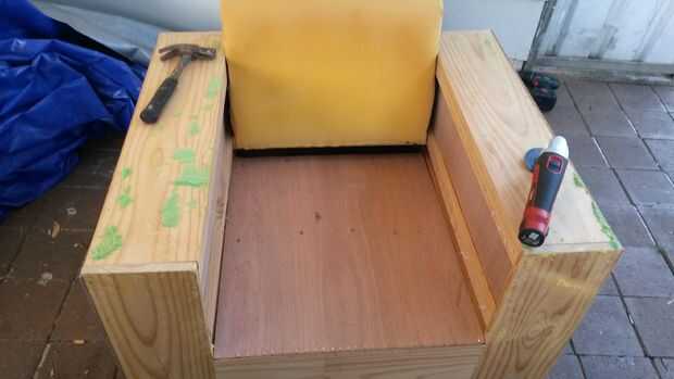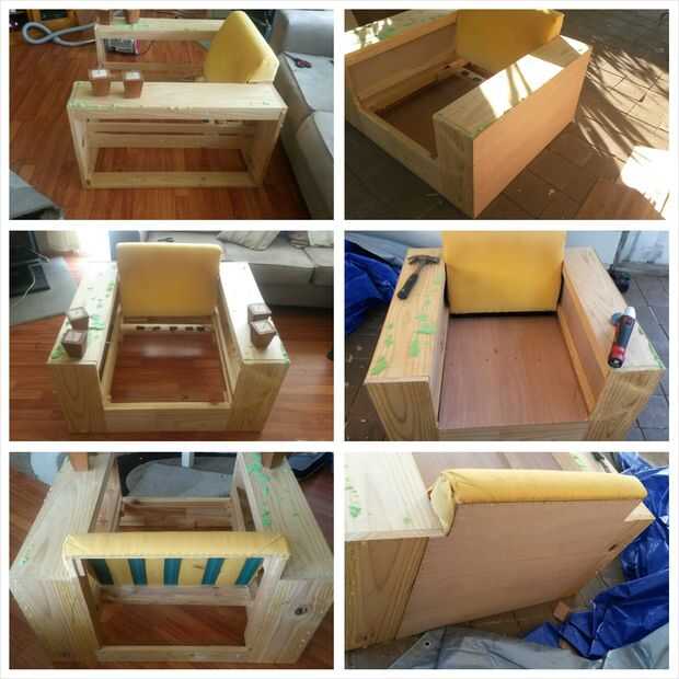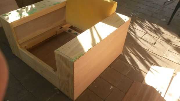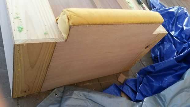 Con las hojas de madera contrachapada que ha conseguido cortar a la medida, puede comenzar a revestimientos a las superficies abiertas por ejemplo los lados, asiento base, parte inferior y el forro. Para ello utilicé Softsheet clavos espaciados 1cm de separación. ¿Es posible que usaba clavos más que lo necesario pero pensé que no hay nada malo con robustez extra un poco, derecho? Derecho!
