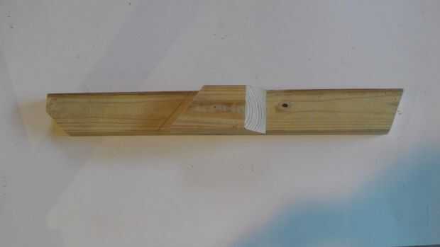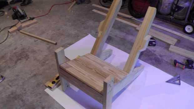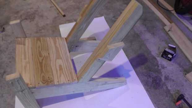 Antes de colocar estas ayudas que necesitamos hacer los soportes del brazo posterior. Éstos apoyan los brazos y hará que el nivel de los brazos de la silla. Para estas piezas Corte una 7 1/2" 2 x 4 y entonces había chaflanado borde en un corte de 45 grados. Sostener la pieza contra la silla y utilice un nivel para determinar el ángulo en el que tendrá que cortar para que el brazo de la silla sentará a nivel de la pata de la silla delantera. Una vez que ambas piezas se cortan y son de nivel pueden fijarse a los soportes laterales. Estos soportes son seguidos por ser atado a la silla.