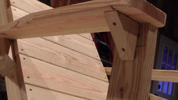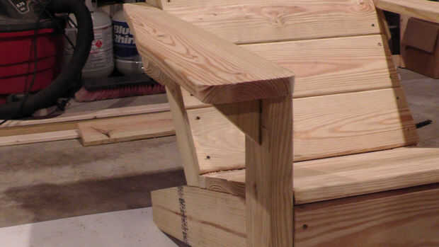 Para la última parte de la Cátedra que tenemos que soporta para la parte delantera de los brazos. Estos donde hecho por cortar un trozo de madera en un cuadrado que mide 3 1/4" por 3 1/4". Esta pieza de madera se cortan en un ángulo de 45 grados y luego aseguró a la silla.