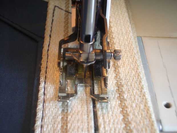 Ahora coser cada una de las 2 secciones de la cinta en su lugar alrededor de los 4 bordes. Una vez más, uso una triple puntada si su máquina lo hace, de lo contrario un par de filas de la costura al lado de uno sería una buena idea. Puede que necesite utilizar un pedazo de cinta junto a la cinta que es de costura al coser por el borde exterior, por lo que el prensatelas tiene algo que agarre en. (Ver foto).