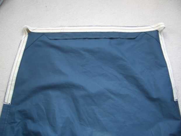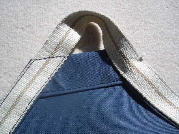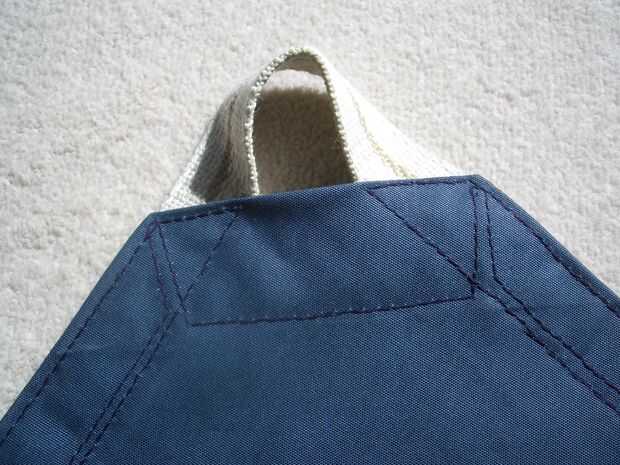 Comience con una esquina delantera. Cada esquina tiene realmente 2 puntos porque se han cortado las esquinas de la distorsión trapezoidal. Voy a llamar a estos la esquina frente y el lado frontal. Marque el punto centro de una de las piezas cortas de cinta con un alfiler y use 2 pines más para marcar los puntos 6.5 cm (2.5") ambos lados de esta, luego retire la patilla central. Coloque la cinta en la parte inferior de la lona con un extremo en el borde lateral y el primer pasador en el frente del lado de la esquina (ver foto). Perno en lugar de la esquina delantera de lado a lo largo del dobladillo de lado hasta el final de la cinta. Hacer lo mismo desde el pin 2 con el otro extremo de la cinta, colocar el pasador en la esquina frontal. Esto hace que una presilla de colgar.