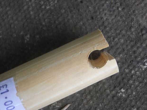 Si lo desea, después de haber leído la advertencia arriba sobre las posibles implicaciones para la estabilidad de la silla al entrar y salir, hacer dos agujeros en el palo de escoba más grande y uno en cada una de las más pequeñas escobas en muescas cortando 2 paralelo corta desde el extremo de los palillos en los agujeros. Las muescas deben ser del mismo ancho que su cuerda fina.