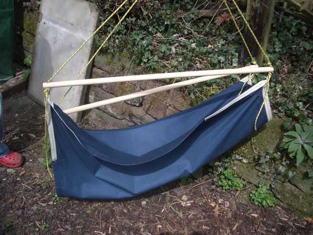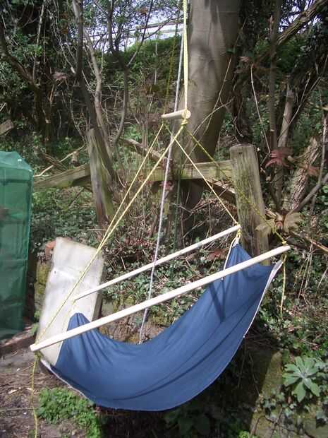 Trate de sentarse en la silla y observe si tiene ganas va a salirse de la parte delantera, o por el contrario si son con punta demasiado hacia atrás así que es difícil sentarse o salir de sí mismo. Puede utilizar el extremo colgando de la cuerda de suspensión a tire usted mismo si es necesario - sólo meter los pies debajo de usted en el suelo y tire hacia arriba. Ajustar la longitud de las cuerdas laterales para ajustar la posición de sentado. Después de hacerlo, otra vez quitar el puntal superior temporalmente (fácil si los extremos son muescas) y dejas colgando de la silla. Los puntales laterales se cuelguen al lado del otro y es fácil de ver si están en el mismo ángulo. Hacer más ajustes hasta que estén. Entonces pop superior del puntal en el y darle otra oportunidad. Cortar el cable sobrante en cada esquina cuando estás feliz.