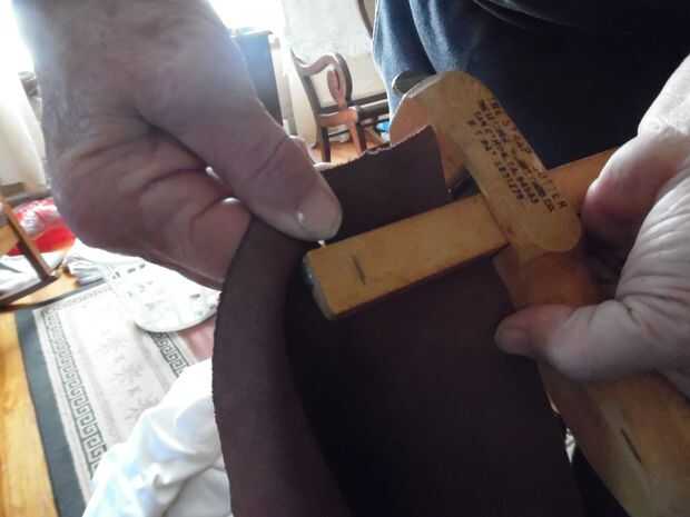 El cortador de la correa de cuero funciona mejor con 2 personas, por lo que mi esposo amablemente ayudó en ese proceso.