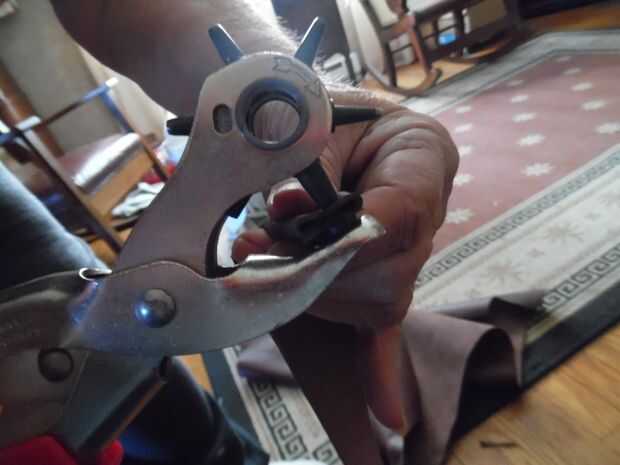 Las bandas verticales, que van desde la parte superior de la silla en la parte delantera de la silla, se ponen en primer lugar. El material debe ser doblado en 3rds en los extremos. Con el punzón giratorio, en el escenario más grande, hacer un agujero. Asegúrese de que el agujero atraviesa toda 3 piezas de material. Enrosque el tornillo a través de los agujeros y colocar en el agujero en el marco de la silla. El material del tornillo hacia abajo.
