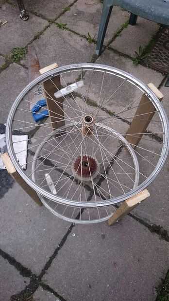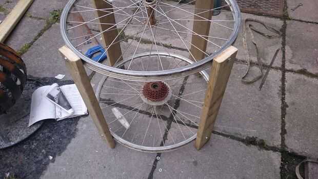 Taladre un orificio de 6mm en cada borde, agujero de taladro en pierna tan superior es al ras con el borde de agujero inferior ahora hasta suficiente fondo de llanta es de la tierra.