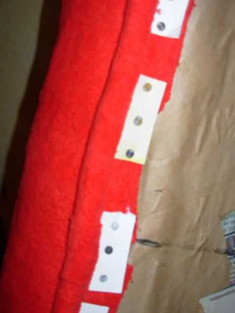 La cubierta exterior se realizó con 2 grandes semicírculos cosidas en el borde largo curvado. Esa pieza fue dado vuelta adentro hacia fuera, se extendía en el baile de la silla y presionada con tira de la tachuela casera. Tira de la tachuela es simplemente cartulina con clavos incrustados en él. Tuve ambos y quería clavos más largos para un mejor asimiento así que hice mi propio.
