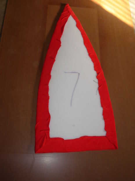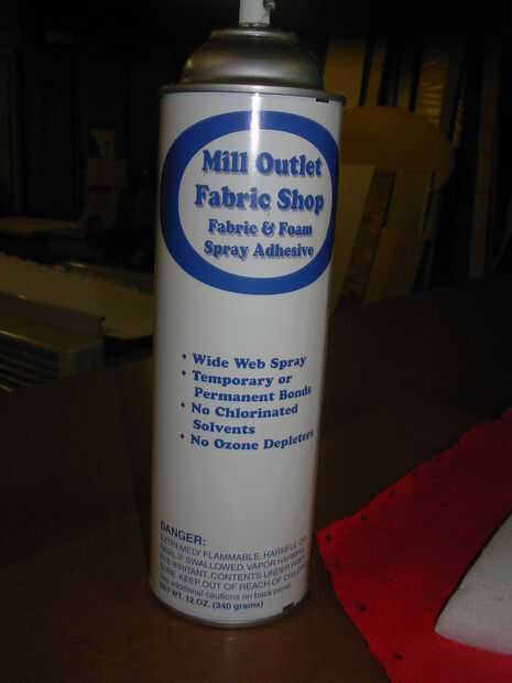 Cada pieza en forma de cuña de espuma tiene su material pegado a él mediante un adhesivo en aerosol tapicería. Sale de la lata en un ventilador en forma de aerosol fibroso como cadena de tonto. Fue perfecto para fijar el material a la espuma. Porque el borde redondeado de mi silla no es una línea recta cada inserto de espuma era diferente. Corte cada pieza para ajustar su posición y numeradas las piezas de lugar y de la espuma. Asegúrese de que no número del lado que es cubierto por la tela.