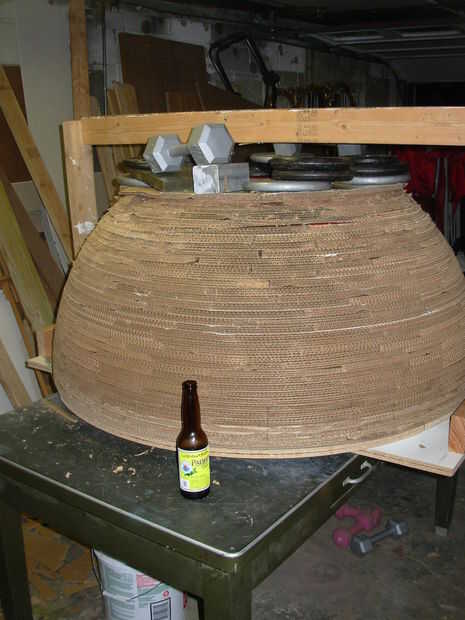 Después del papel de capas secas totalmente utilizan una herramienta metálica fina como un gran bar de cincel o palanca para trabajar el cartón media esfera de la placa giratoria. Las grapas que se utilizan para sostener la primera capa hacia abajo del rasgón de la cartulina, pero causa poco daño. Las zonas desgarradas finalmente se cubrirá de todos modos.