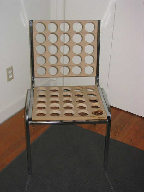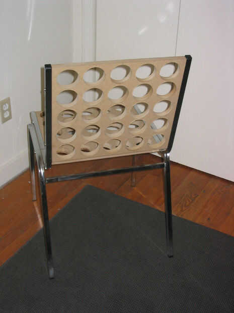 5. usando una broca del cortador del agujero y un taladro, un agujero 2-5/8" de diámetro en cada una de las intersecciones de veinticinco en cada rejilla en cada pieza de MDF. Este agujero de tamaño es ligeramente más grande que el diámetro de una pelota de tenis nuevo (aprox. 2-1/2").