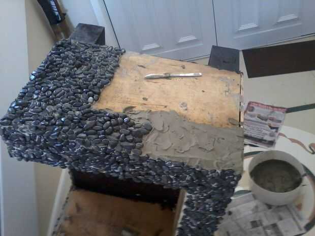 Esto es tedioso con piedrecitas, tardé horas, afortunadamente tuvimos una marcha de 15 horas corte y tenía nada más que hacer (fue acabada por la luz de la antorcha) hacer una pequeña zona a la vez y lechada en terminación. Si se mezcla un poco de la lechada coloreada con el cemento de mampostería es más fácil ya que no tiene que cubrir cada poco poco expuesta de cemento blanco, deseo que había pensado eso antes!