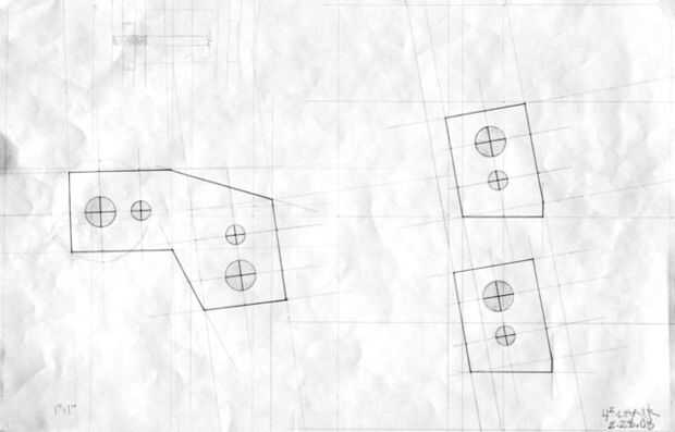 Después de muchos borradores, tratando de conseguir las proporciones y los ángulos derecha permaneciendo todavía dentro de mi regla de dieciséis pulgadas, me ocurrió con estos dibujos. Hice los dibujos conjuntos completo, las fotocopias, aerosol-montado les en aislamiento rígido de espuma de poliestireno y cortar las formas con una sierra de cinta. Les hice un poco grande porque el proceso de fundición no es súper preciso y dejé un margen a la máquina hacia abajo más tarde. Como en mis otros posts, puede imprimir estos dibujos y medir una de las piezas de madera contrachapada en la vista de dibujo. Ya sabes que tiene que ser de dieciséis pulgadas, dividirlo hacia fuera para conseguir una escala. En cuanto a las juntas, las "patas" o piezas con los orificios en ellas, son dos y media pulgadas de largo por dos pulgadas.