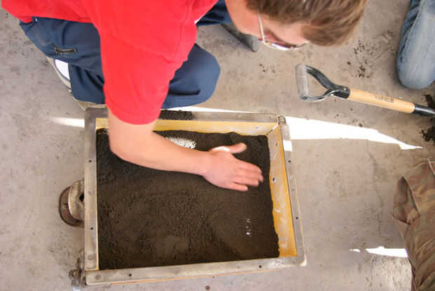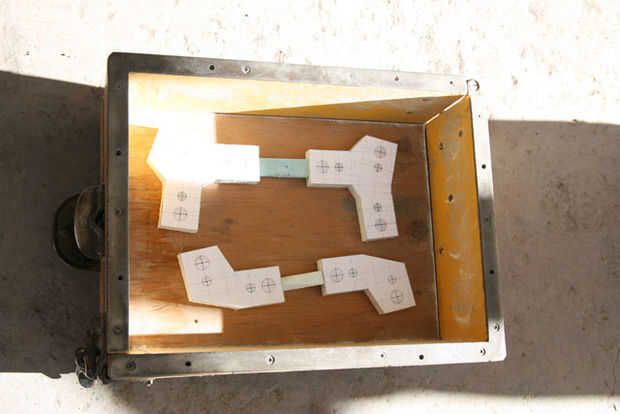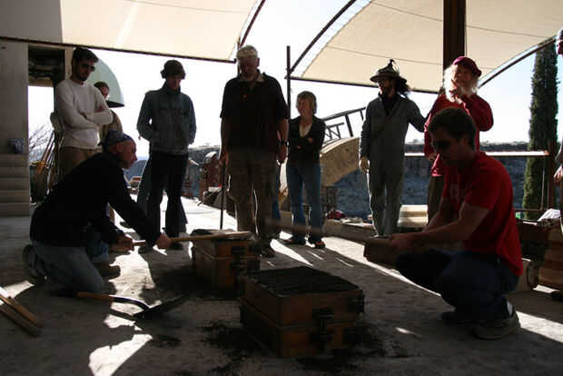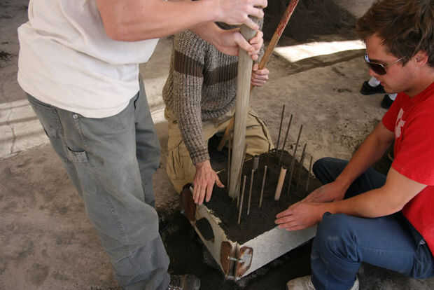 Mucha compactación comienza, con el mango de la pala. Es increíble cuánto puede cram en esa cajita de arena. La cuarta foto muestra la compactación, con el frasco del complemento volteado. Ahora se agrega otro pedazo, y la parte inferior la mitad del molde se construye del mismo modo.