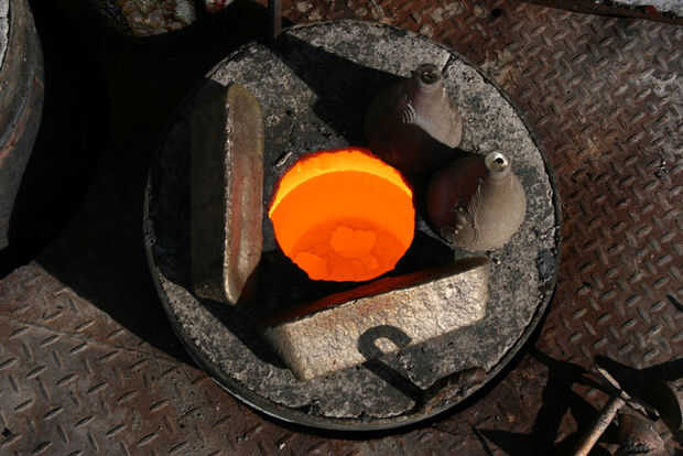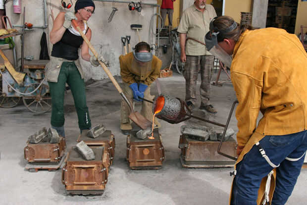 El último paso es verter, como Andy y Jim manejar el yugo y el crisol, y Caboeiria a sofocar cualquier salidas de golpe o derrames.