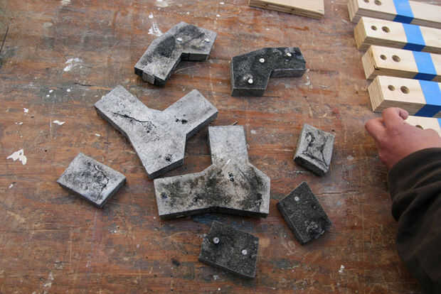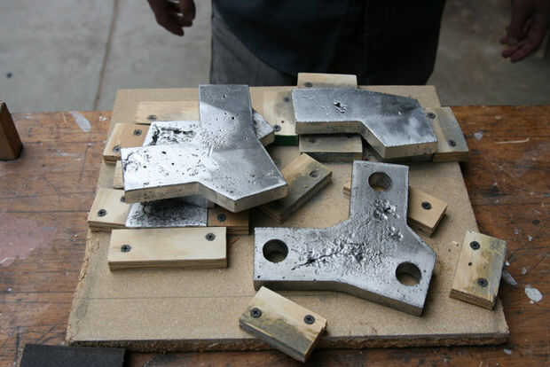 La primera imagen muestra las articulaciones desde el molde, cubierto todavía con algo de arena. Mecanizan las juntas hacia abajo con una sierra de banda en primer lugar, para quitar la mayor parte del material. Entonces construí un jig para mantenerlos constantemente y utiliza una lijadora orbital de 1/4 hoja para molerlas con papel muy grueso. Creo que usa piso acabado primero lija de grano 60, luego trabajó hasta 150 o así para alisar hacia fuera. La lijadora de banco resulta útil aquí también, pero tenga a mano algo de agua ya caliente el aluminio consigue real, realmente rápido. Siempre use guantes y una máscara de polvo mecanizado de aluminio, o bien esos pequeños pedacitos de metal se terminen en los pulmones.