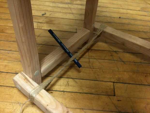 Una vez que se han insertado todas las clavijas uso hilo para envolver alrededor de cualquier pedazos necesitan celebrará juntas mientras se está secando el pegamento. Para asegurar éstos después de envolverlos y atar la cuerda, tome un lápiz a través de la cuerda en el centro y gírela hasta que este suficientemente apretado en que punto debe colocarse el lápiz para mantener la cuerda impartido por él contra apoyando en una viga. (ver última foto)