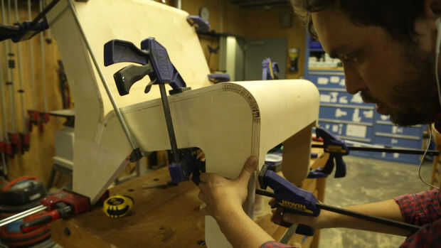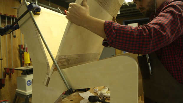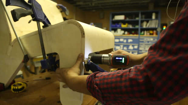 Los lados de la silla son capas dobles de madera para la estabilidad. En orden para la silla entera a cortar de una hoja de 4'X 8' de madera contrachapada, tuve que cortar una de estas capas. Como resultado, empecé con la pieza de lado entero y había pegado de las piezas cortadas que empareja a la.