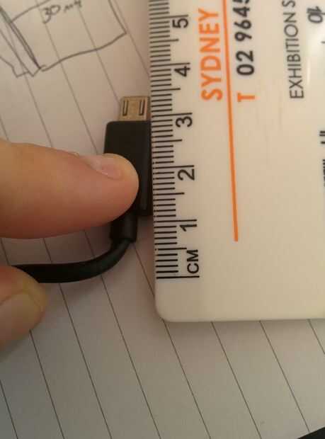 Desafortunadamente yo no puedo tomar una foto de mi móvil, como estoy escribiendo esto en él. La mejor manera de hacer las medidas es decidir cuánto del teléfono debe cubrirse por su silla. Mi movil (nexus 5) es delgado, por lo que he elegido un espesor de 30mm. El cargador es complicado, requiere de 30mm para curva y carga (Foto 2). Es por eso que he hecho a la altura de la base 50mm.