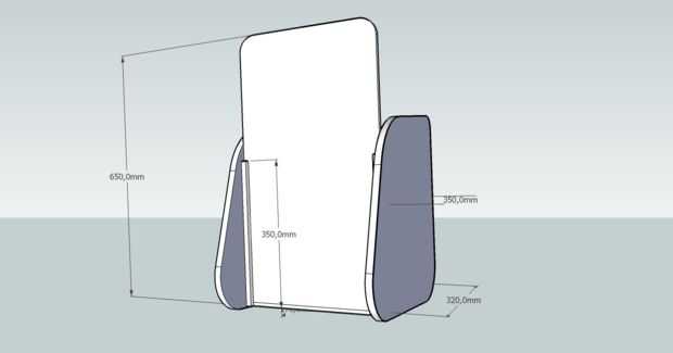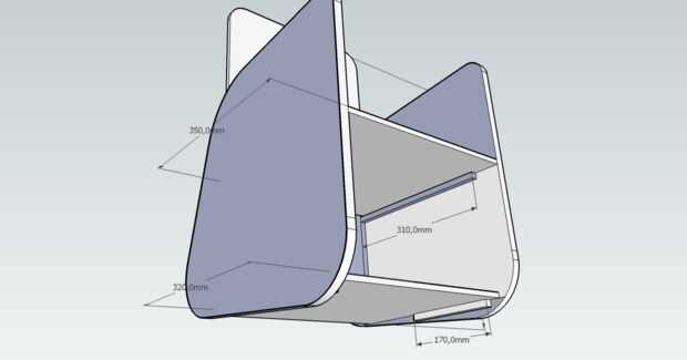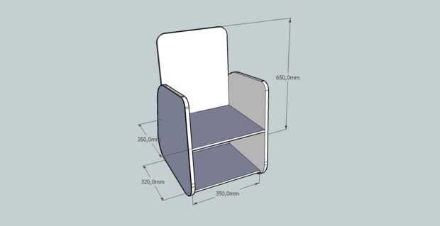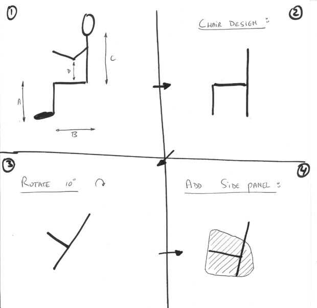 Sólo necesita unas pocas dimensiones básicas de tu hijo a esta silla de diseño (ver boceto para el proceso de diseño). Una vez que estas dimensiones que se puede hacer paneles de cualquier forma de la cara, porque el método de construcción es siempre la misma. Por razones de comodidad, he girado todo el diseño 10 grados.