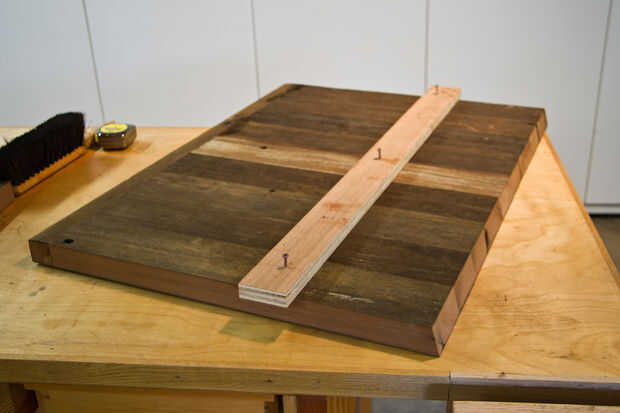 Colocar las nueve piezas de la espalda de lado a lado e incluso hasta los bordes superiores. Abrazadera juntos para mantenerlos firmemente mientras pegue y atornille la pieza superior a ellos.