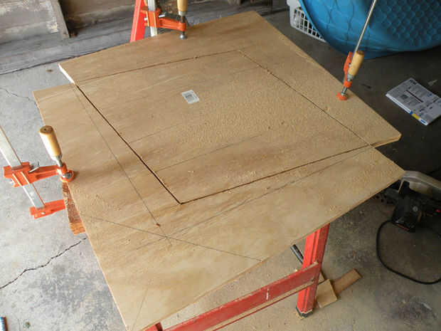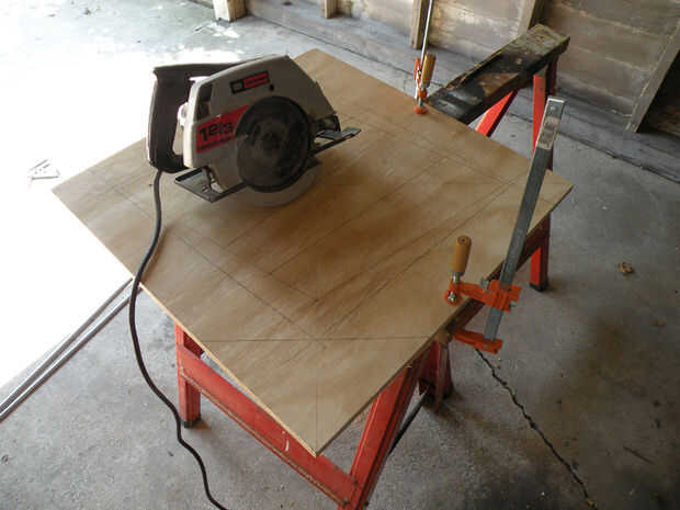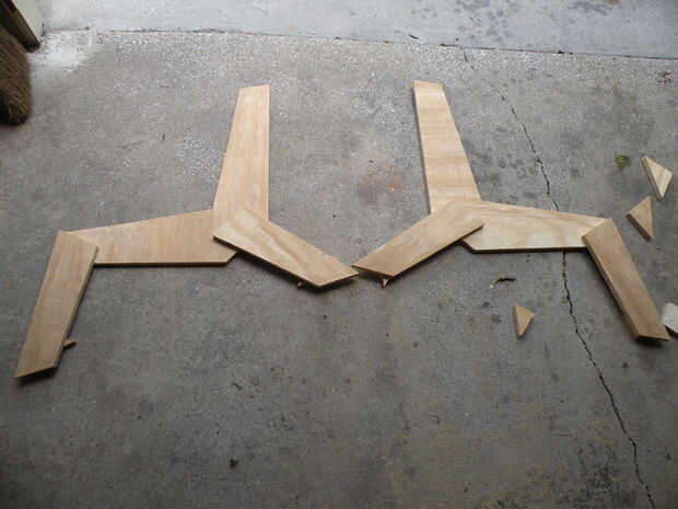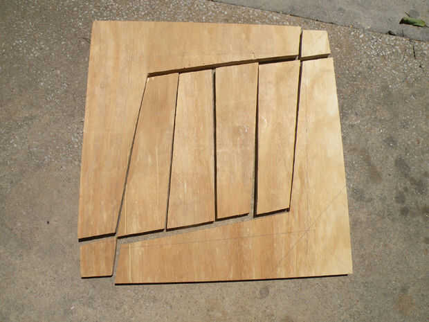 Colocar las piezas y cortar con una sierra de cinta, sierra circular y jigsaw. Cortar el sobrante del centro en cuatro partes aproximadamente iguales, o dos pares de piezas que emparejan. Hice las patas traseras un poco más anchos que la parte delantera.