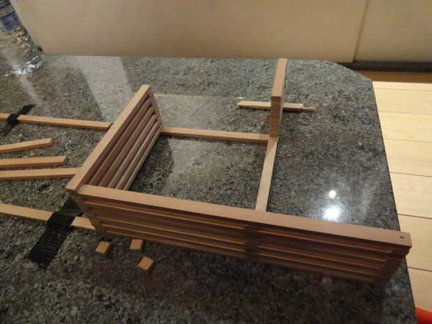 Después de aserrar las piezas es sólo una cuestión de pegar en el orden correcto. Entre los listones, utilicé gotas de pegamento de madera. Hice un VIDEO para que puedas ver el orden en el que tienes que pegar...
