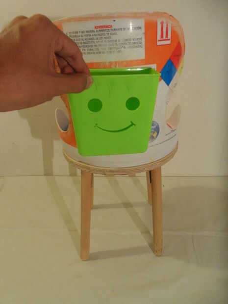 puede Agregar el cubo de juguete de baño en la parte posterior del sit con algunos tornillos o utilizando silicona o un pegamento especial para plástico. Usé dos tornillos con tuerca o rosca (cualquier nombre tiene)