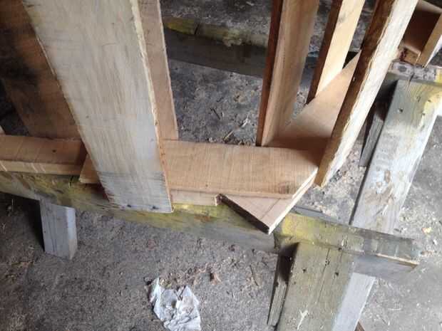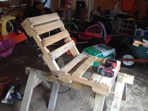 Usando un listón de la mitad desechado de la paleta (no los pedazos de centro guardado de antes) insertar dentro del asiento para un apoyo extra. Cortar el ángulo para emparejar y atornille en su lugar. Hacerlo en ambos lados.