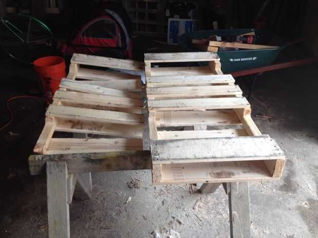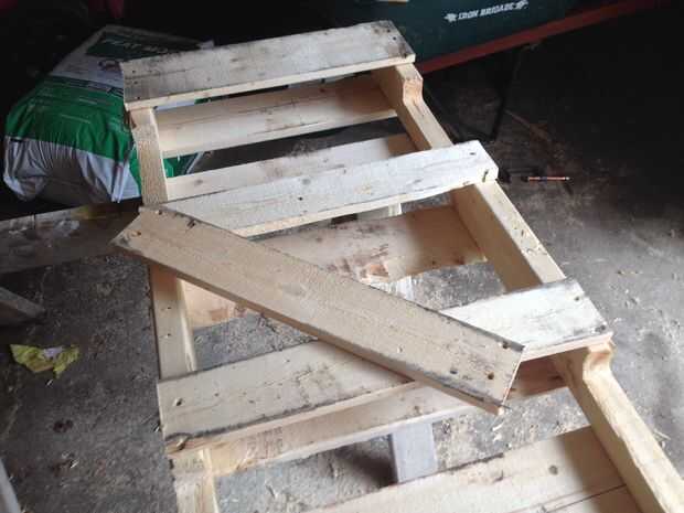 hecha de tablas de palets y madera repuesto. Sólo el costo fue de tornillos y pintura de aerosol.