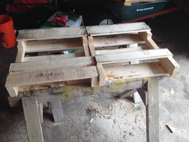 hecha de tablas de palets y madera repuesto. Sólo el costo fue de tornillos y pintura de aerosol.