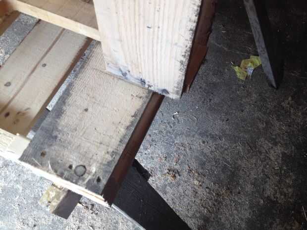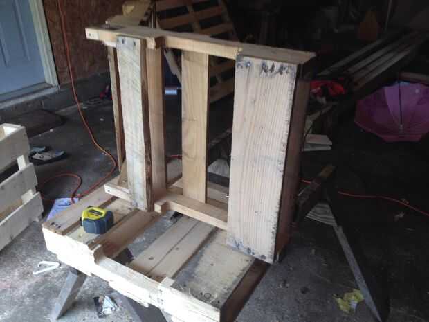 hecha de tablas de palets y madera repuesto. Sólo el costo fue de tornillos y pintura de aerosol.