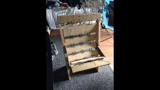 hecha de tablas de palets y madera repuesto. Sólo el costo fue de tornillos y pintura de aerosol.
