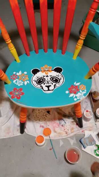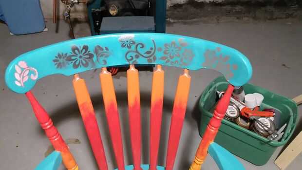 Ahora con mi silla pintada. Quería tener un poco más. Vi flores y vides etc con frecuencia en el mater fuente que busqué, así que como mi flor pintura habilidades son par de sub. Me agarró algunas plantillas de flores, así como cortar algunos de mi propia salida que imprimí apague el equipo.