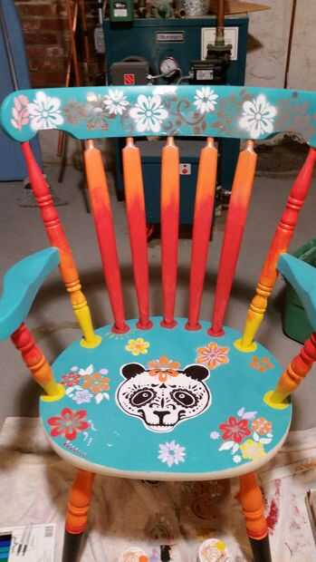 El producto final pintado y contento con la silla general. Muy temerosos de exageración en este punto. Tomé la silla fuera después de que se seque completamente. (honestamente dejé que sientan más y un día) Entonces llevó a con el poliuretano semi brillante para sellar, proteger y dar un brillo.