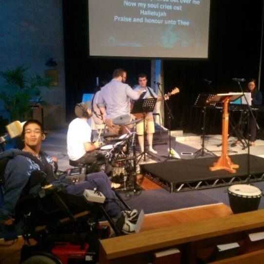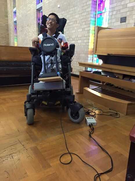 Este tambor electrónico de la máquina es accionada por botones en el soporte de la cabeza de su silla de ruedas. Ahora es capaz de unirse a la iglesia adoración equipo de soporte y ayuda la congregación en su canto y la alabanza. Ir a Sam!
