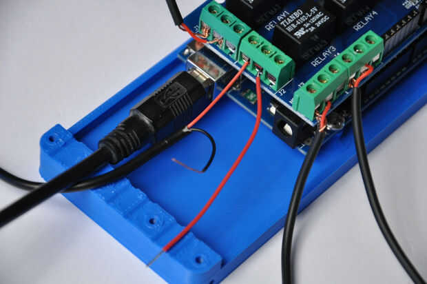Si tienes suerte, como yo, usted tendrá una base con aislamiento rojo y uno negro. El rojo es positivo, y negro es tierra. Si no tienes suerte, tendrás que averiguar la polaridad del cable con un polímetro. Usted también necesitará un trozo pequeño del cable con los extremos pelados, como en la foto, digamos 6 cm de largo. Ahora Conecte el cable rojo (positivo) desde el cable de usb no en el número del bloque de terminal dos. Luego fije el pedazo corto de alambre a COM. Como en la tercera foto.