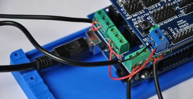 Luego conecte el cable negro a la tierra en el bloque de terminales en el escudo de servo/sensor. Y el extremo del cable corto para VCC. Al igual que en la última foto.