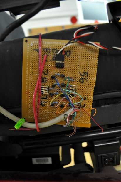 Si la silla de ruedas no hace nada, gire la perilla a la izquierda hasta que la velocidad más baja deseada. Desconecte el resistor, medida con un medidor de ohmios y escribir todo (cómo fue conectado y lo que hizo la silla). Hacerlo de nuevo y encontrar la menor resistencia y la velocidad máxima deseada y escriba. Para esta dirección, se necesita una resistencia para cada uno de los dos transistores asociados - uno será el valor de la primera prueba (movimiento lento) y el otro será (consigue listo) el inverso del inverso del valor de la segunda prueba menos el inverso del valor de la primera prueba. Así, cuando ambos transistores están activados, la silla de ruedas ve la resistencia de la segunda prueba. Usted puede siempre a la vuelta de valores si no tiene el número exacto de la derecha. Estas resistencias y los dos siguientes se pondrán a los transistores de baja en el esquema, tirando el cable de la palanca de mando hacia la tierra cuando se activan los transistores.