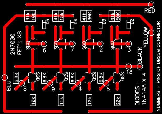 Los otros cuatro transistores están conectados entre la tierra y una resistencia a la fuente de alimentación de 12 voltios. Estos transistores son normalmente en, y su terminal de drenaje está conectada a través de un diodo al cable delantero/al revés o de izquierda. Cuando estos transistores se dan vuelta apagado, el resistor ya no se tira hacia la tierra y el cable del joystick es tirado hacia el + 12v cable a través del diodo.