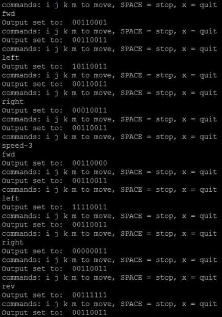 Ahora que se está ejecutando el programa Python, como en la imagen de abajo, pulsando una de las teclas de movimiento causará el programa a Arduino para enviar la silla de ruedas en esa dirección por un corto tiempo y luego Dile que deje de funcionar. Presionar el 1, 2 ó 3 teclas establecerá el programa de "velocidad" de 1 2 o 3. En velocidad 1, se activa el transistor del menor para cada dirección. En velocidad 2, se activa el transistor principal (el que está con la resistencia del arrendador). En velocidad 3, se activa dos transistores (vistos como 1 o 0 en la pantalla de texto a continuación).