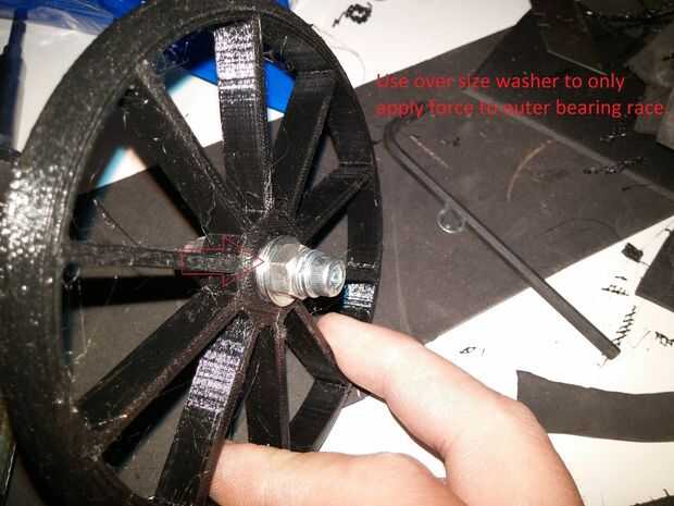 2. ahora es el momento para las ruedas. Cada rueda rodillos en un rodamiento interno y externo idéntico. El cojinete en la rueda de la manera más fácil es utilizar un perno de 5mm y un par sobre arandelas de tamaño para los rodamientos en la rueda. Tendrá el tamaño de las arandelas para asegurarse de que sólo están poniendo presión en la pista exterior del rodamiento. Con rodamientos instalan es hora de colocar la rueda en la horquilla. Luego coloque una tuerca en cada tornillo y apriete hasta que en contacto con la llanta. Ahora girar las ruedas y ver lo bien gira. Si parecen arrastrar trate de aflojar la tuerca sólo un poco. Si gira libremente pero la rueda tiene un montón de bamboleo de lado a lado trate de apretar la tuerca. Continúe ajustando hasta que la rueda gira libremente con poca oscilación.
