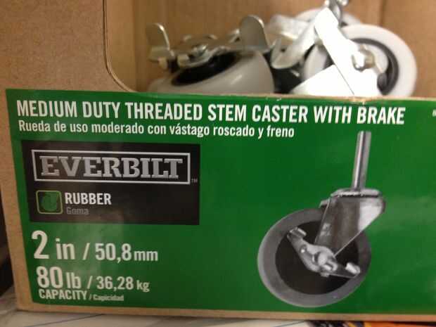 - Ruedas, las ruedas que utilicé fueron Everbilt en 2 de 50, 8 mm, con una capacidad de 80 lb. (he añadido una foto de la etiqueta, si con comprar el mismo ruedas. cuestan unos $5 cada uno).