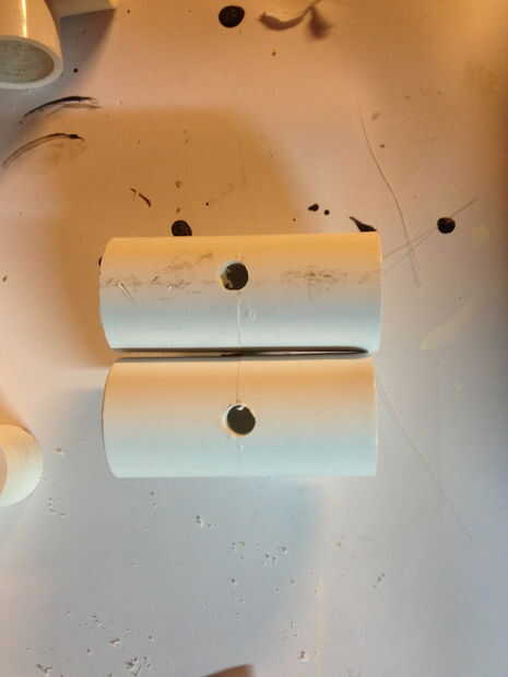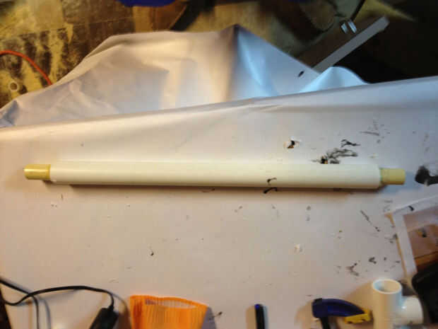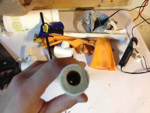 Segundo paso (opcional): lo que hice fue cayó un pasador de madera en el tubo y perforó un agujero completamente a través de, (un poco más grande que 3/8). asegurar con pegamento caliente en el interior. lo hice con la esperanza de reducir la flexión, y aumentar la integridad estructural del compartimiento del eje. Aunque puedo recomiendo este paso es totalmente opcional e innecesarios.