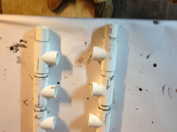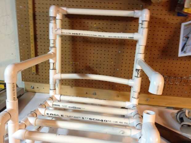 Montaje de la base de la silla es probablemente la parte más difícil y molestosa de la silla. Asegúrese de siempre vuelva a verificar su silla con las imágenes que he proporcionado. primero en la capa inferior vas a necesitar insertar una 4 1/2" pieza en la parte inferior, y un 2 5/8" pieza en la capa superior como se muestra. (Asegúrese de que las piezas de tubo conectivo sólo utilizadas en la capa superior son las piezas de 2 5/8, la razón de la medida siendo tan específico es si utilizas cualquier otra longitud que no encaja en la parte de asiento real). siguiente solo en la diapositiva de la parte inferior la porción del árbol que ya han construido en el extremo expuesto de la tubería de 4 1/2". en el extremo abierto de la porción del eje añadir un 5" pieza (pero recuerde no cemento estas juntos). a continuación en el extremo expuesto del 6" pieza Deslice un conector de 45° en el ángulo representado. el siguiente paso es unirse a otro conector de 45° hacia el sentido contrario. conéctelas a 45° utilizando un pedazo de 2 pulgadas de PVC, para que PVC no es visible una vez que hayan conectado. En el extremo expuesto de la 45° del conector añadimos 2' pieza de PVC y un conector de salida hacia arriba en el extremo. El último paso para la capa inferior de la silla agregar otro 2" pieza en el extremo del conector Tee y deslizar un conector de cuatro vías en el extremo. la apertura hacia abajo de las 4 vías será donde el tubo que sostiene las ruedas de apoyo. ahora para la capa superior, sugiero que construir esto por separado como se muestra en los cuadros proporcionados, utilizar 2 5/8" piezas de PVC y alternativas ellos deslizantes conectores de t regulares entre ellos. Luego de cemento una vez que ambos lados se han completado 18" pedazos entre ellos al mismo tiempo, porque una vez han cementado uno no podrás cemento otro pulgadas debe haber un lado que tiene un racor de PVC expuesto. este lado debe ser hacia adelante, y debe deslizarse una Tee conector w/salida en el extremo. (Asegúrese de que quede la forma correcta). Esta pieza de Tee conector w/salida debe conectar la capa inferior y superior, con un 4 1/2 pulgada pieza. ahora para la parte superior de la Tee conector w/salida Conecte un conector Tee regular en la parte superior usando una 2" pieza y luego en la parte superior Conecte un trozo de 90 º mirando hacia atrás con un pedazo de 5 1/2. Esto constituirá el resto del brazo. terminar el resto del brazo con el pedazo de 16 pulgadas, que debe alinearse con uno de los conectores de salida en la parte posterior de la silla. ahora para la última pieza de la base, añadir un conector de 90° al conector Tee en la parte delantera y conectar a la pieza de 4 vías en la parte inferior con el último de la PVC 8", piezas. 90° debe conectarse el conector t con 2" pieza.