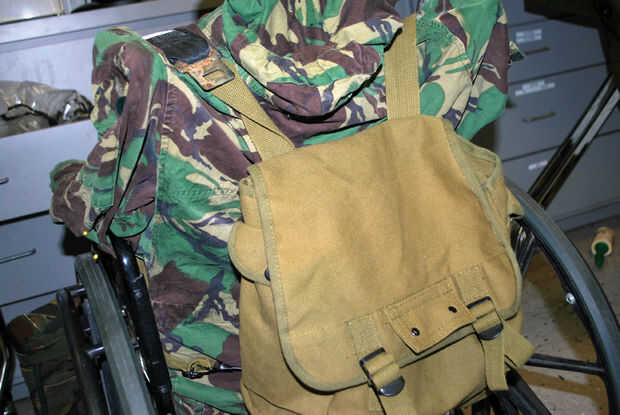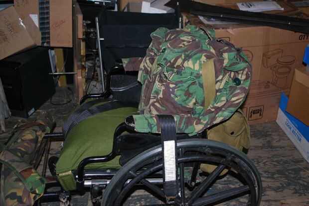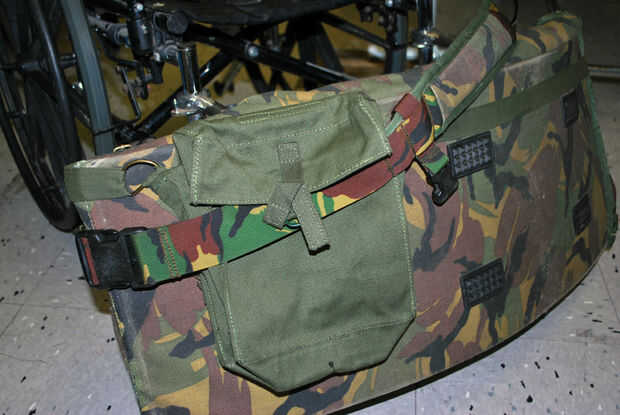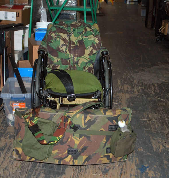 Ahora era el momento de personalizar la silla de ruedas! El Departamento de apoyos en mi concierto de TV tenía una gran colección de bolsos de excedentes militares, paquetes y tal. Había un montón de opciones para jugar con.