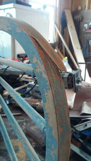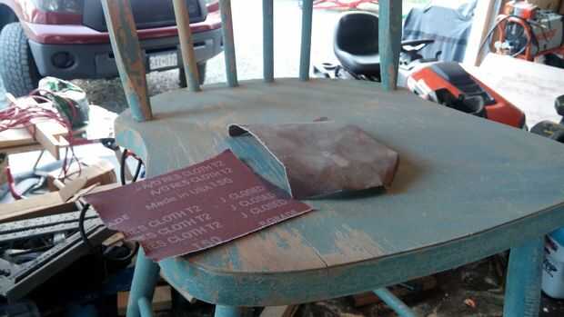 Lo primero que hice fue arena de toda la pintura suelta y alisado solo cosas en preparación de la aplicación de polietileno. Una de las sillas tenía una pieza rota de madera en la parte posterior pero en vez de pegar