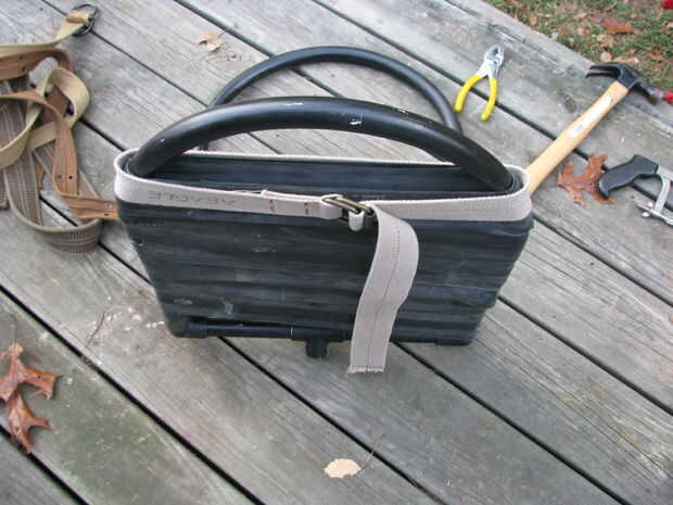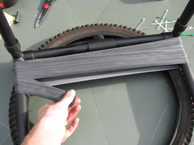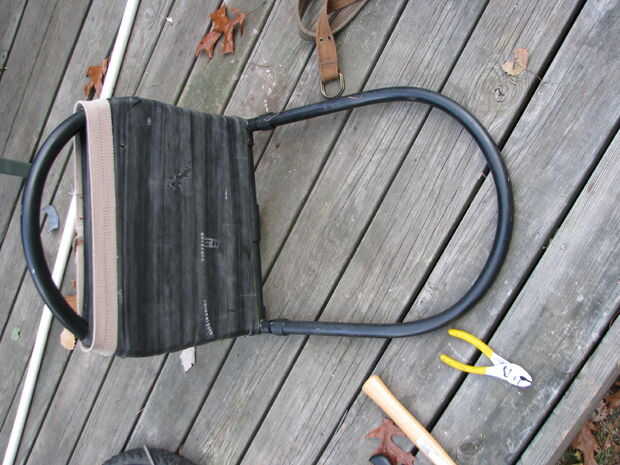 A continuación, debe envolver a uno de los tubos alrededor de sí mismo modo anclado luego envuélvalo alrededor de la otra barra de pvc y continuar, cuando un tubo de comienzo a final con otro. Cuando piensas en el hecho con una mitad de la silla, tomar una correa vieja y apretar justo en el extremo suelto.