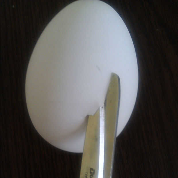 Corte una forma ovalada en el huevo. Lije las asperezas. Haga un pequeño agujero en la parte superior, apenas lo suficientemente grande como para que un trozo de alambre para ir a través.